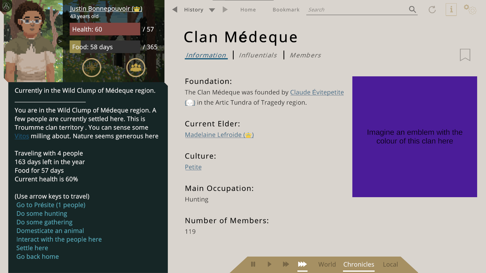 As a Master of Design (MDes) graduate, Chroniqueur was the project I used for my research thesis about user interface (UI) design for emergent story discovery. In short, one of the main appeals of emergent narrative games is the stories they can generate. However, these games tend to be complex simulations, resulting in a large amount of information that makes the discoverability of narratives challenging. To alleviate this problem, we believe redesigning the user interface and experience can facilitate the discovery process of stories. Our theory is that web design might be a promising avenue, more specifically, Wikipedia and web browsers.