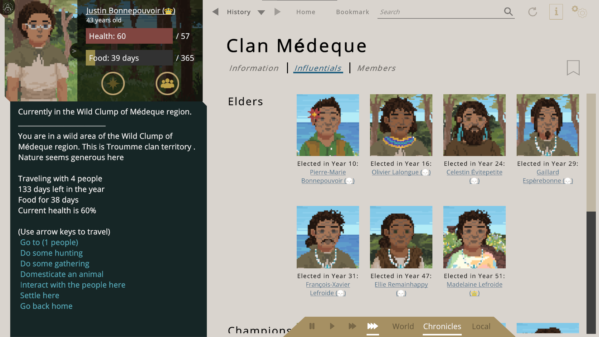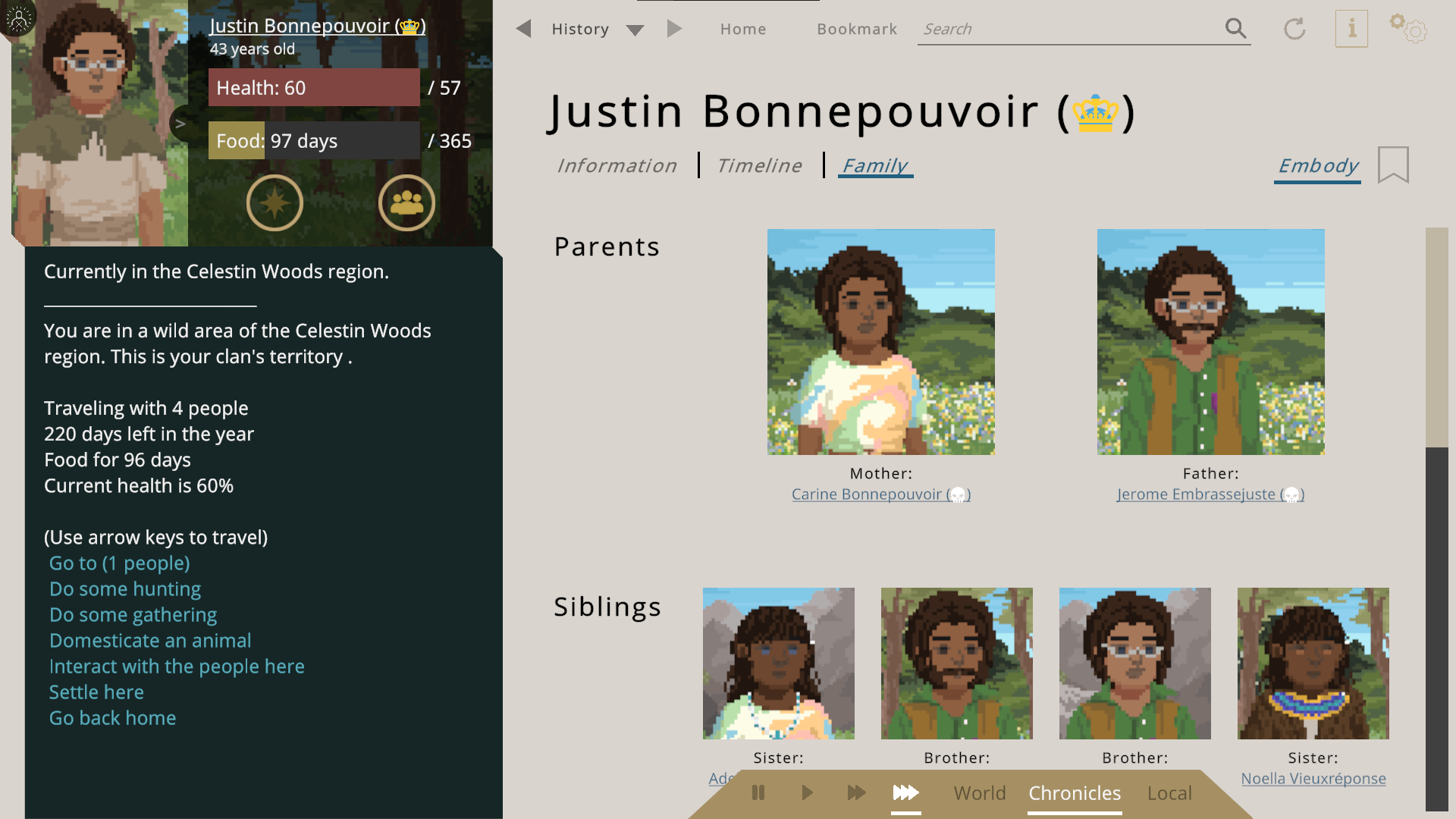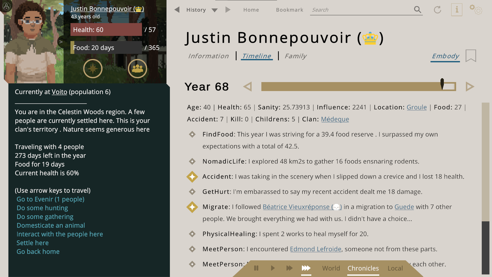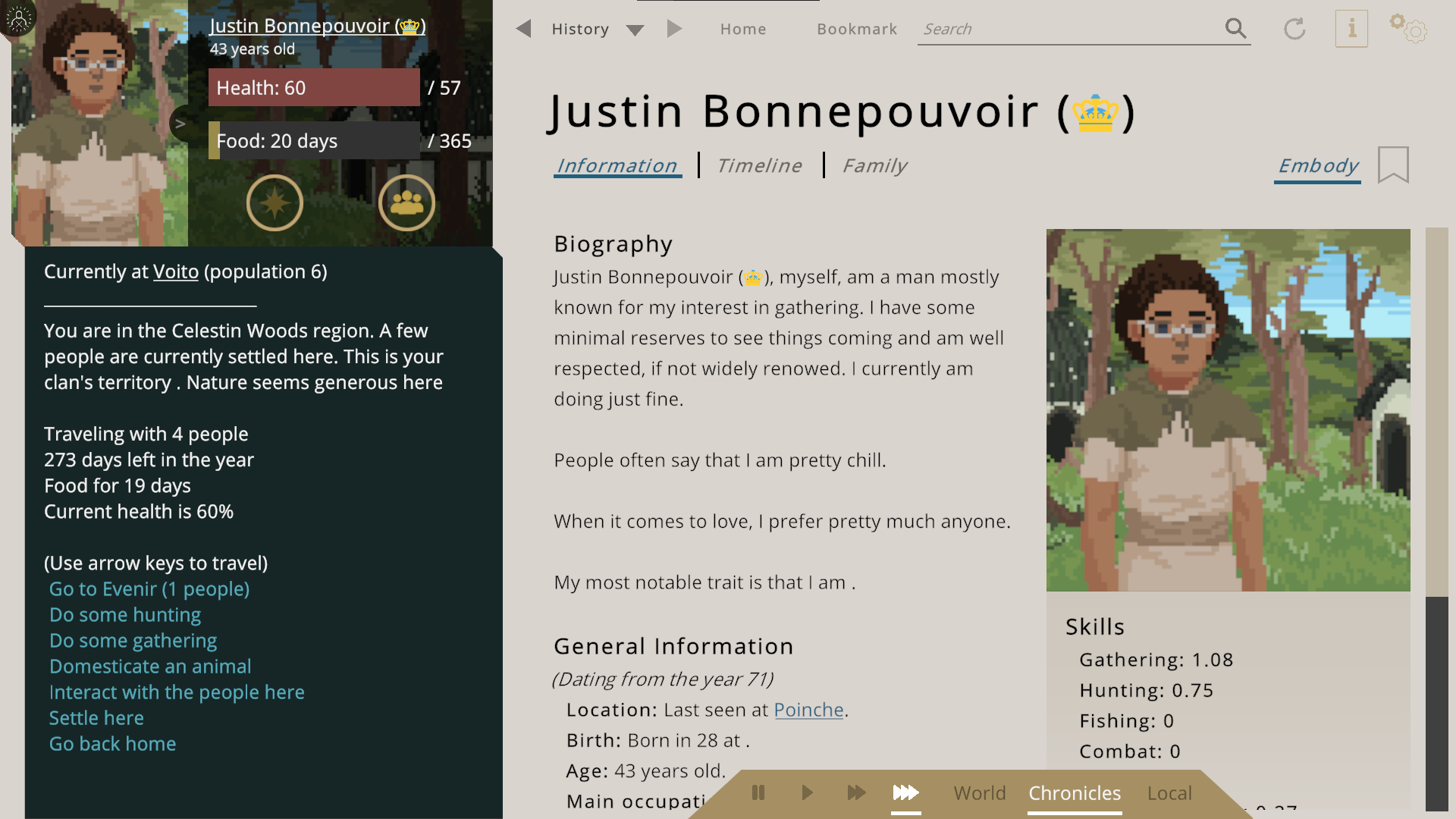 Chroniqueur is an emergent narrative experimentation platform. It is a deep social simulation generating a full human history that is completely documented. Players can both explore this archive freely and/or engage in embedded games.