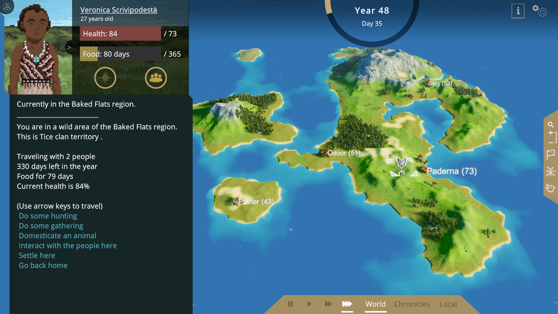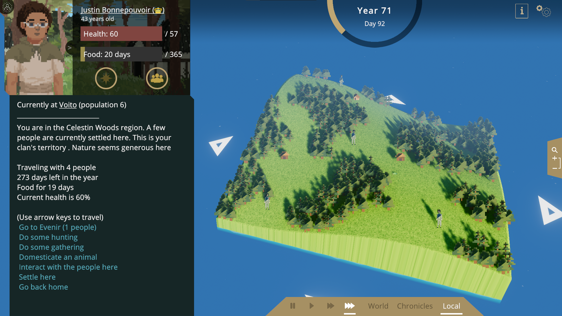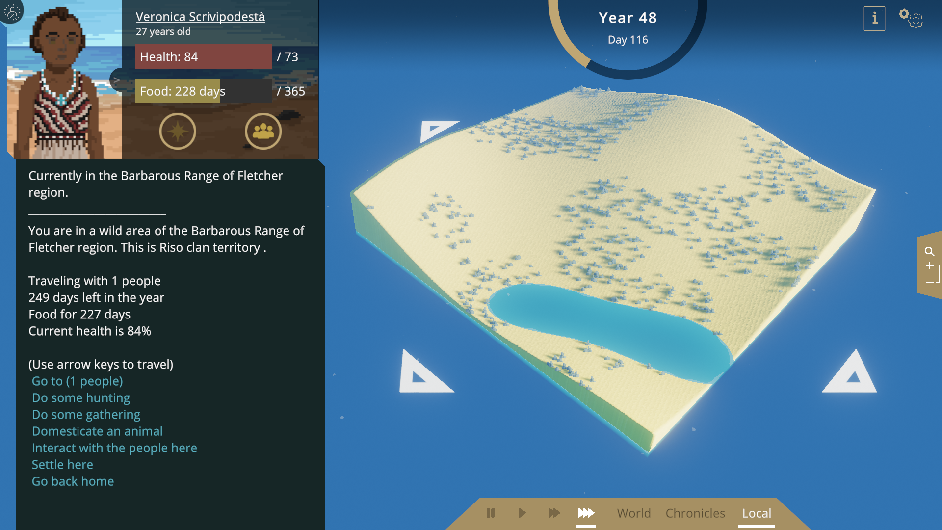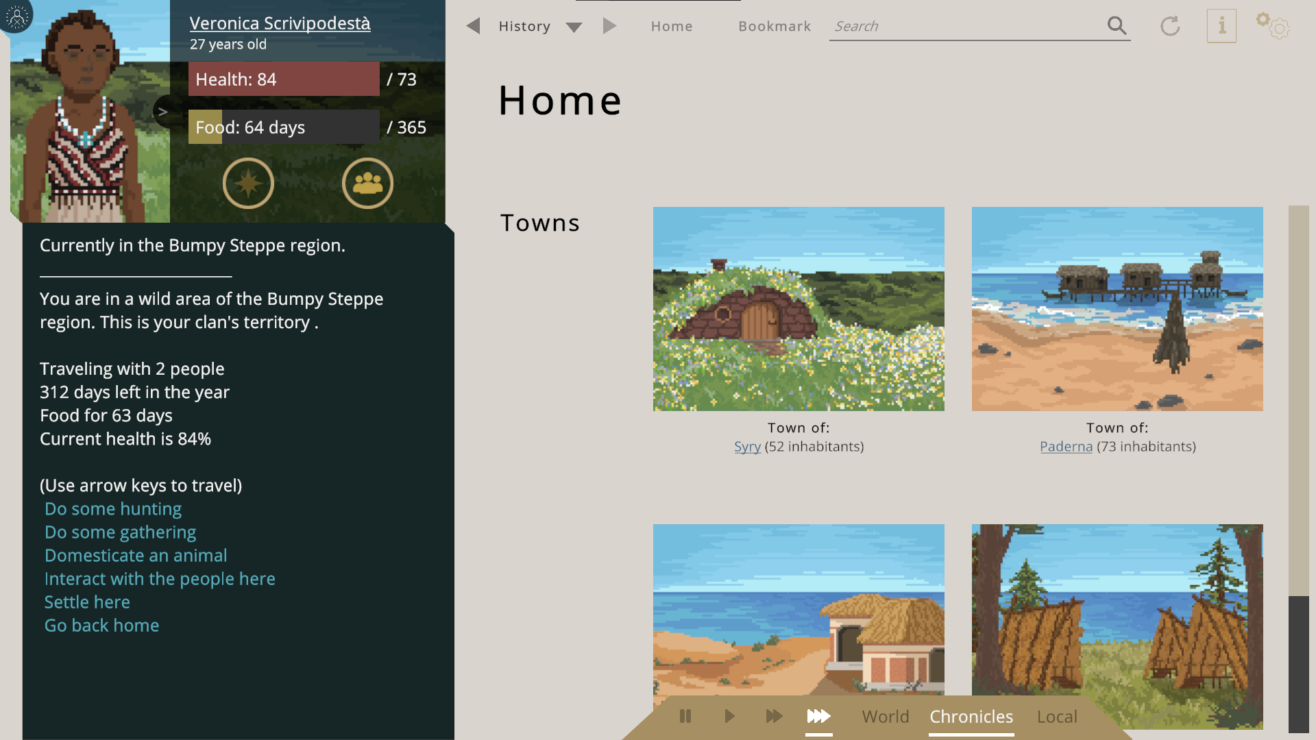 Chroniqueur is an emergent narrative experimentation platform. It is a deep social simulation generating a full human history that is completely documented. Players can both explore this archive freely and/or engage in embedded games.